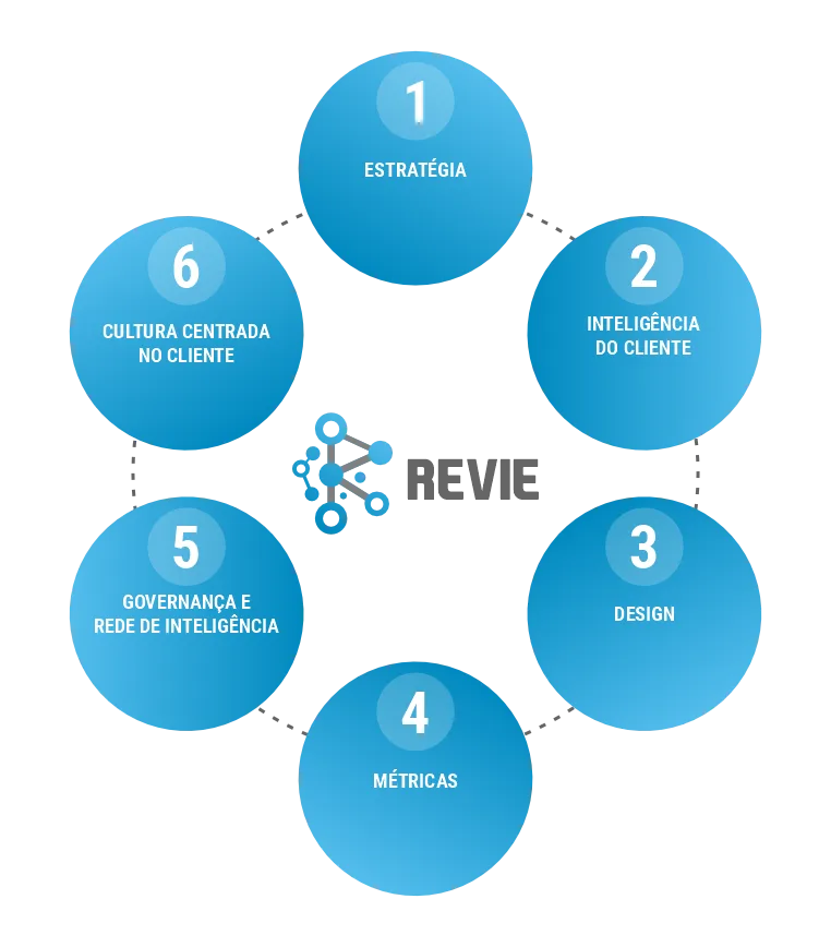 Um dos diferenciais do nosso trabalho é que utilizamos toda a nossa experiência em Estratégia e Customer Analytics com foco em resultados e em ações periódicas, além da nossa Metodologia Revie (Rede de Valor para Inteligência Empresarial) que ordena e facilita a implementação centrada no cliente e em dados com RESULTADOS mensuráveis.